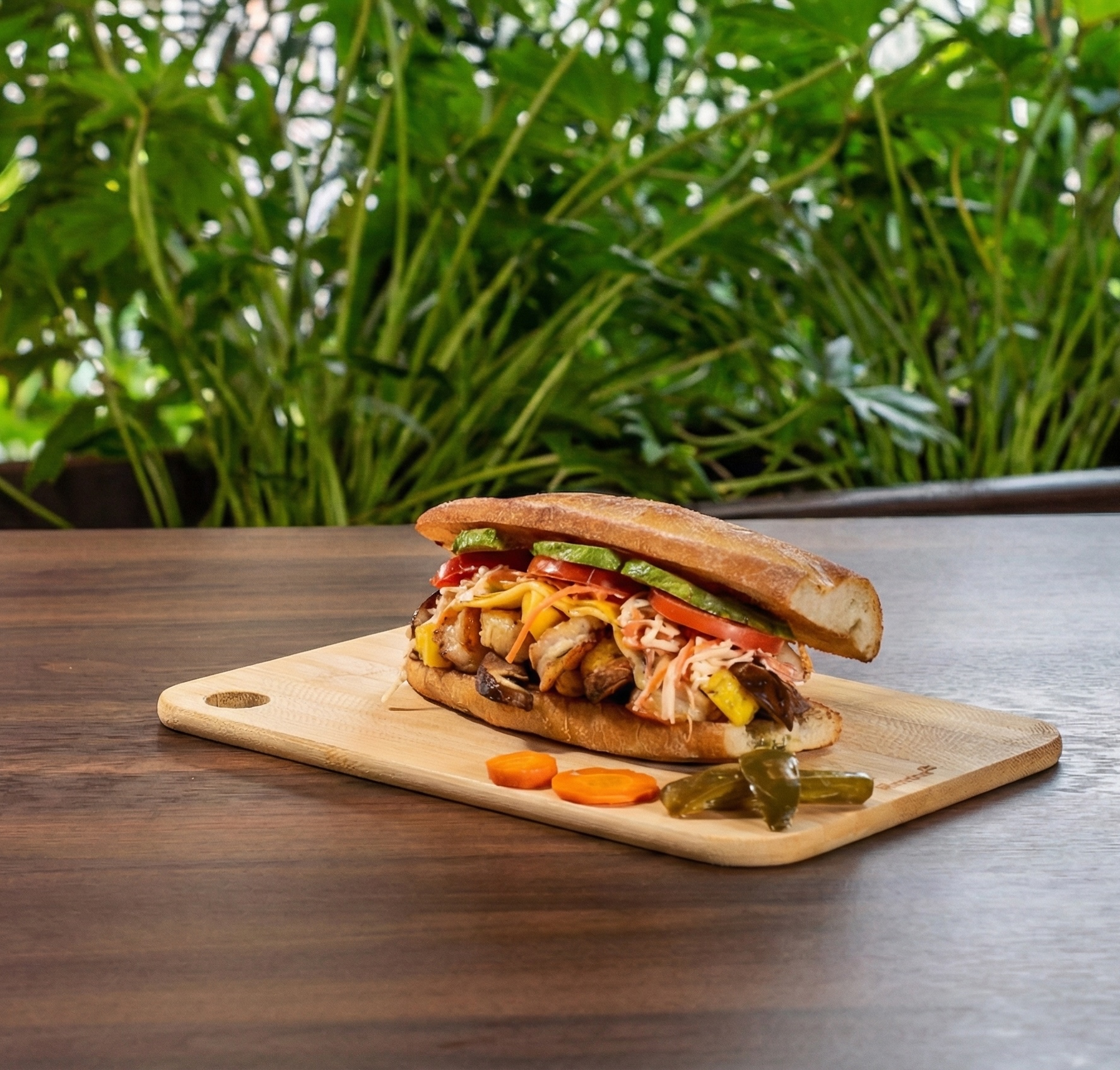 Jamón, tocino, champiñón con queso manchego, lechuga, jitomate, cebolla y aguacate.